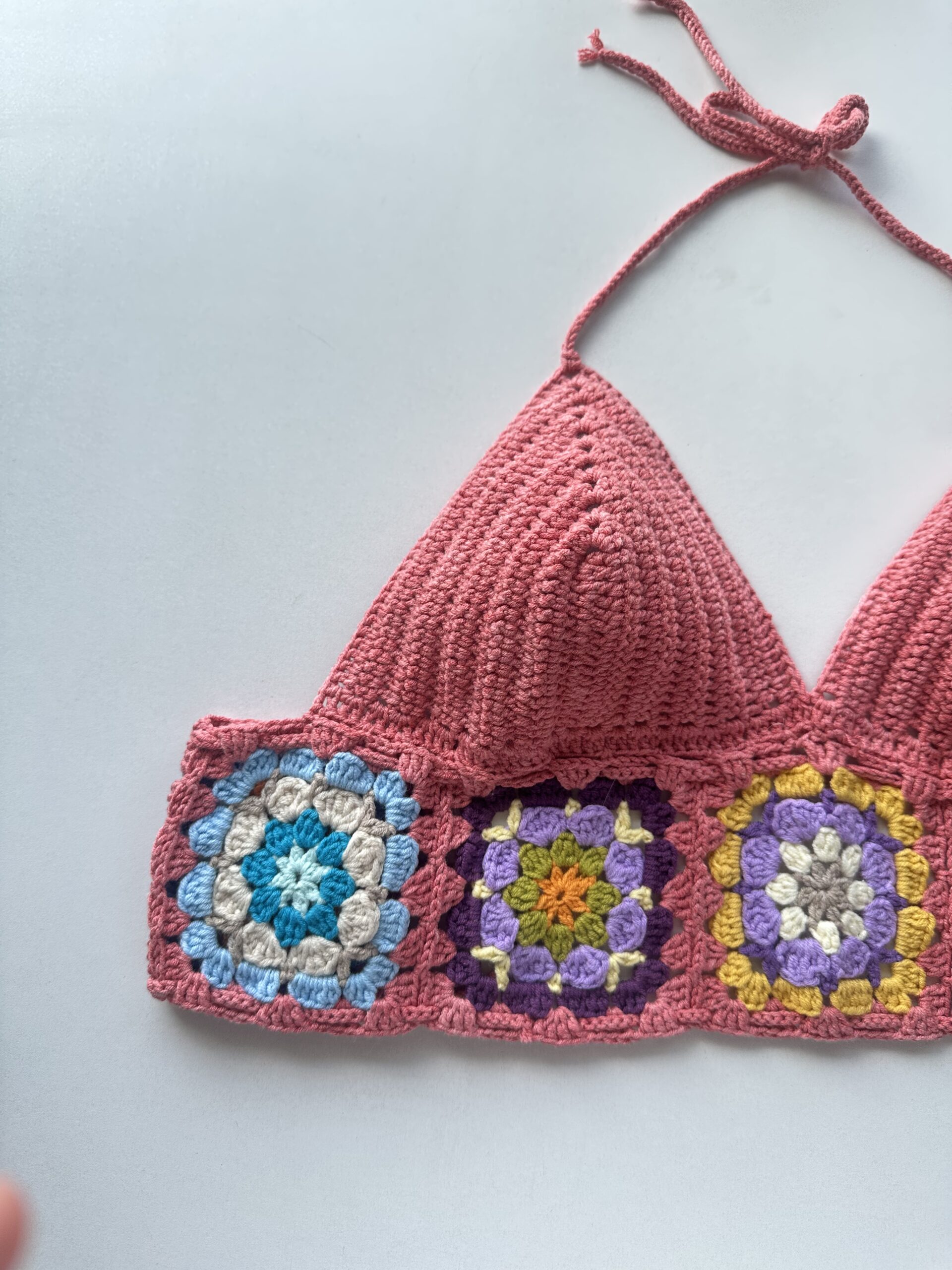 Voor wie op zoek is naar iets speels en kleurrijks: de Aurora crochet crop top is verkrijgbaar in zeven unieke kleuren, van Amethyst tot Sunflower. Elk exemplaar wordt speciaal voor jou gehaakt.