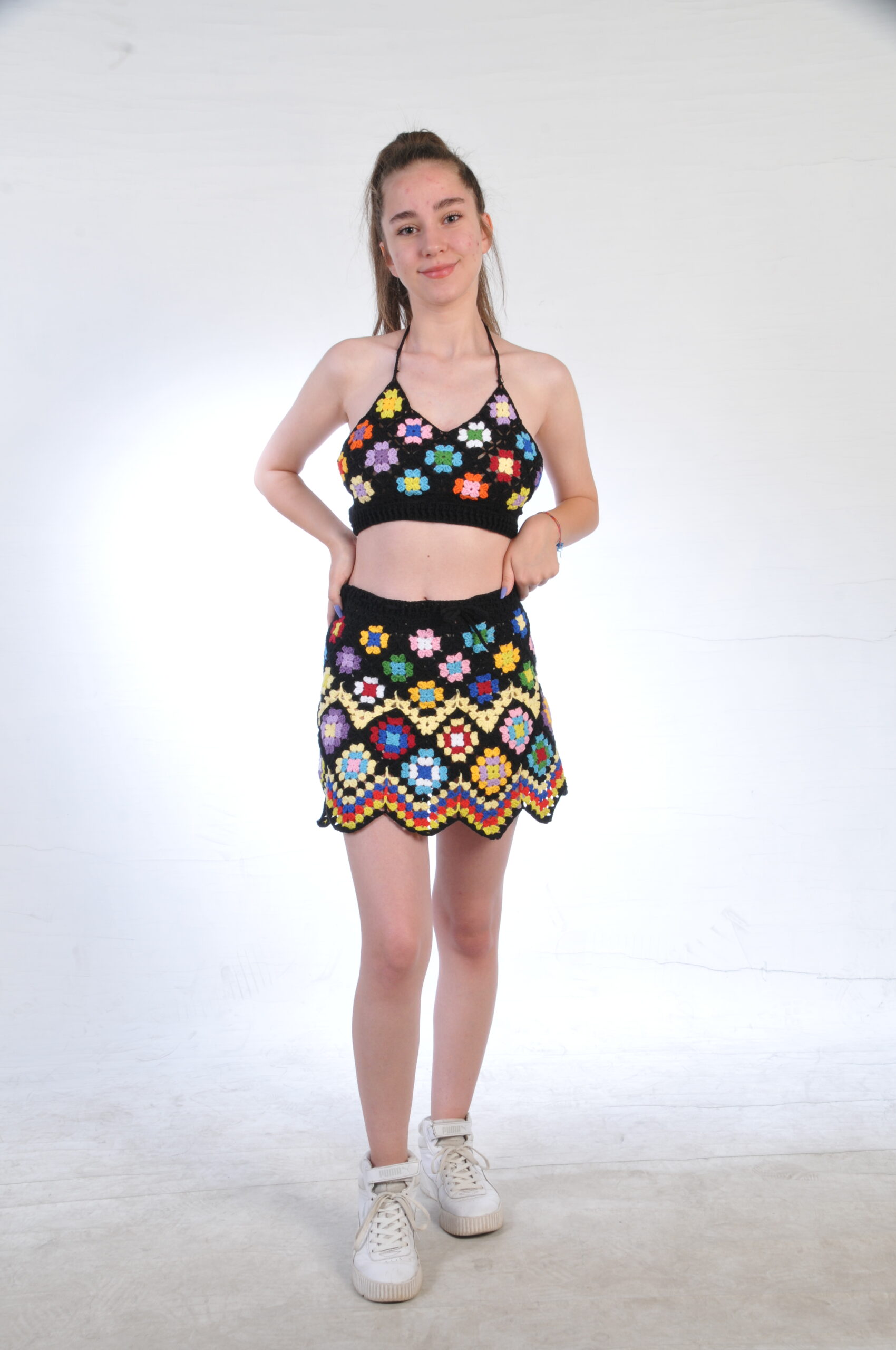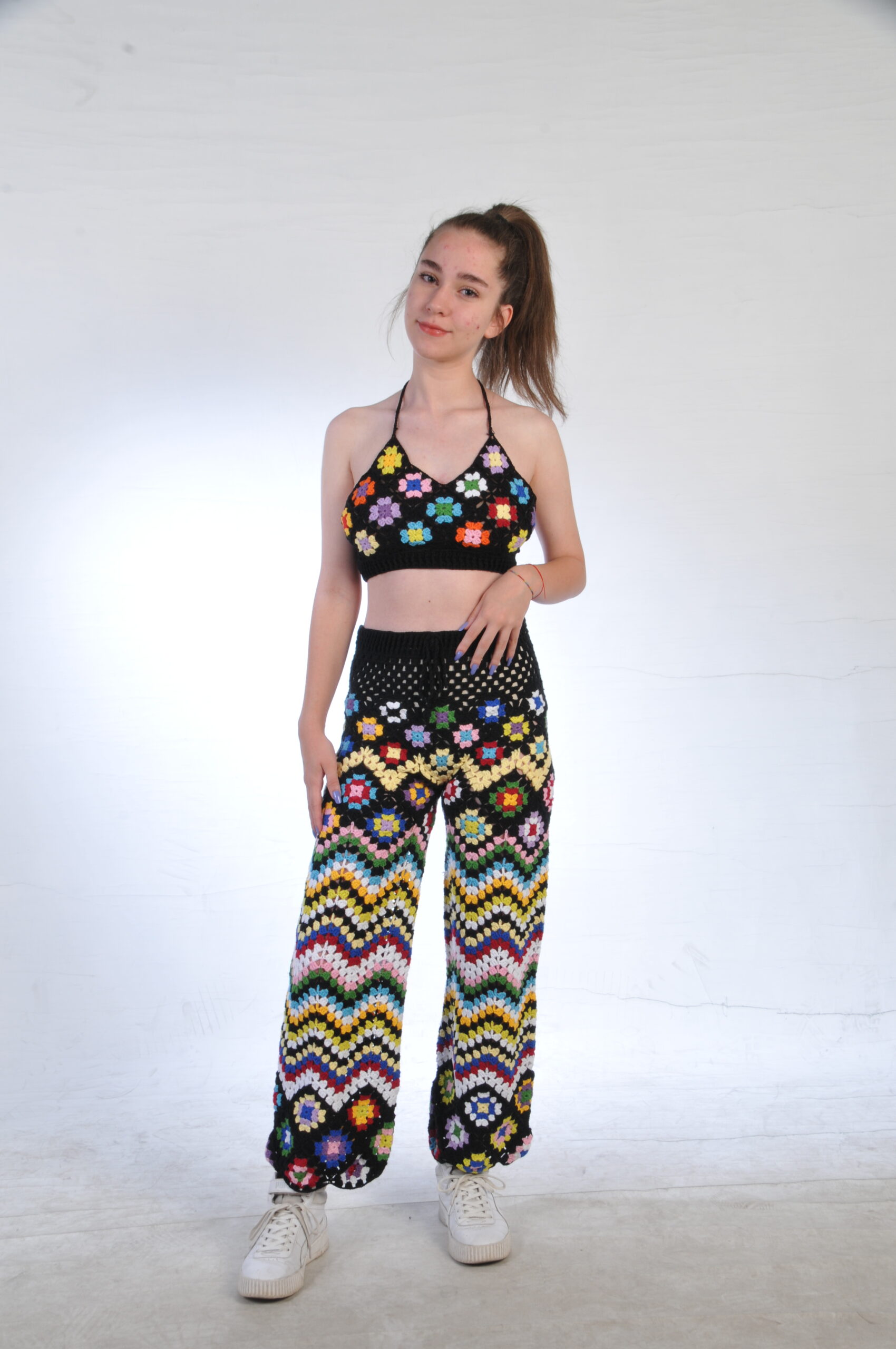 De Wildflower is een handgemaakte crochet set met een halter top en een lange broek, beide met een zwarte basis en een dynamisch, kleurrijk patroon.